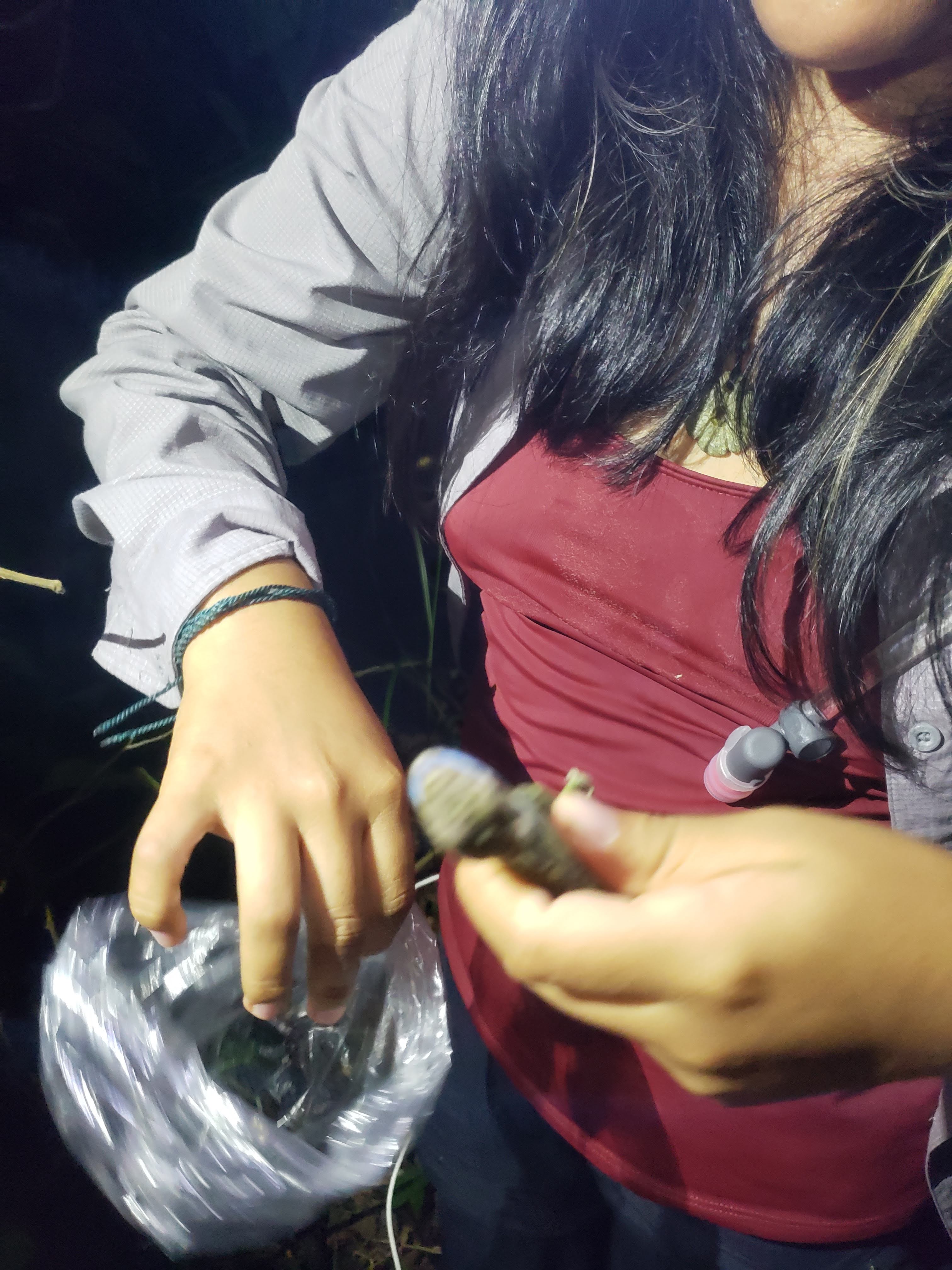 Went on Ves tonight. Kinda nice. Went out at 7:30 pm returned at 9:30 pm. Got one frog and captured a lizard. Cora and Sam caught him by hand, bagged him and brought him back for identification.