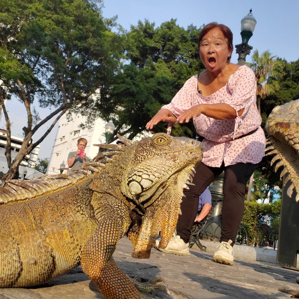 Guayaquil is intriguing to me. It is a big city and known as an unsafe place. I want to see the Iguana park and I am staying in a hotel right next to the park. The next day I walked to the park and met George, who takes these interesting photos with the iguanas.