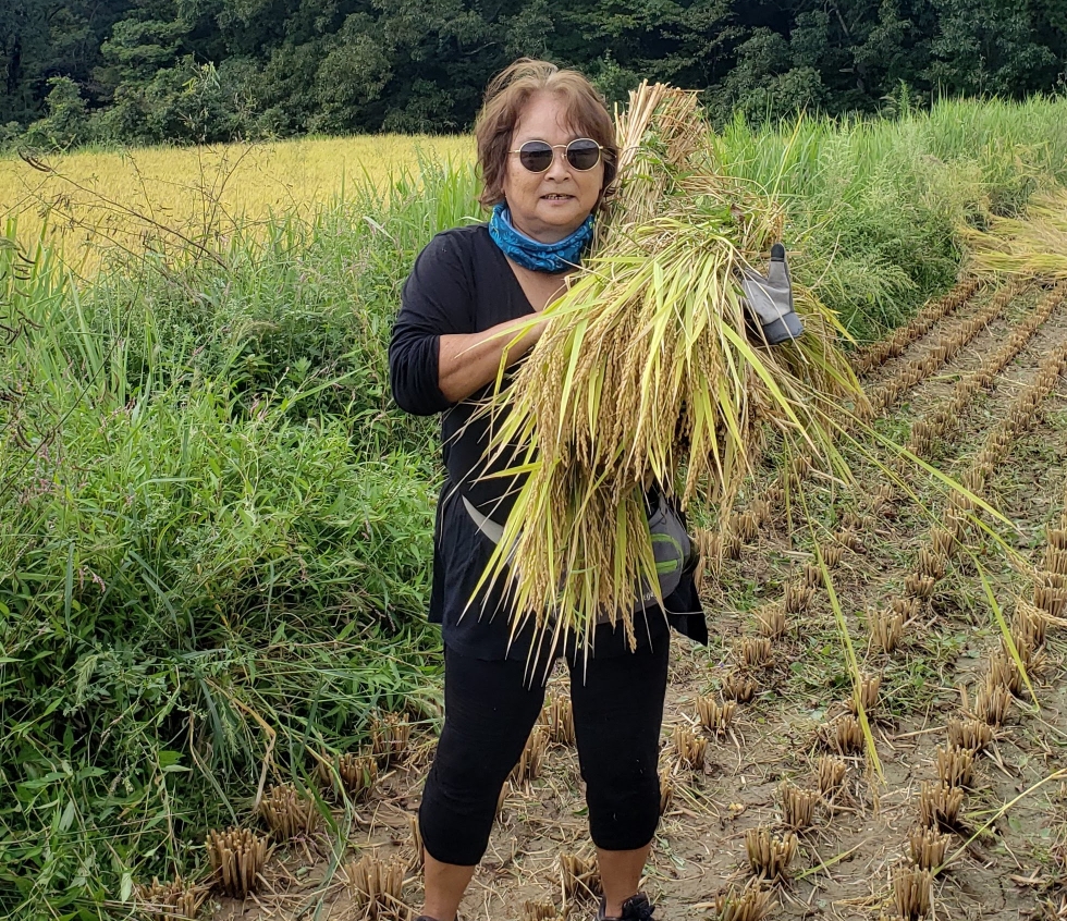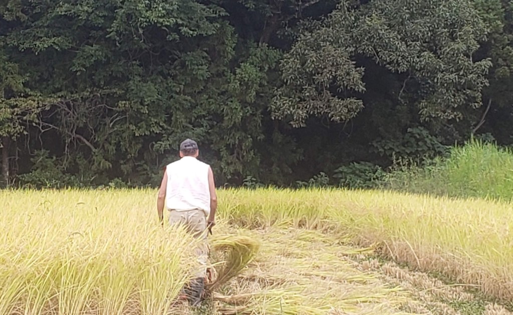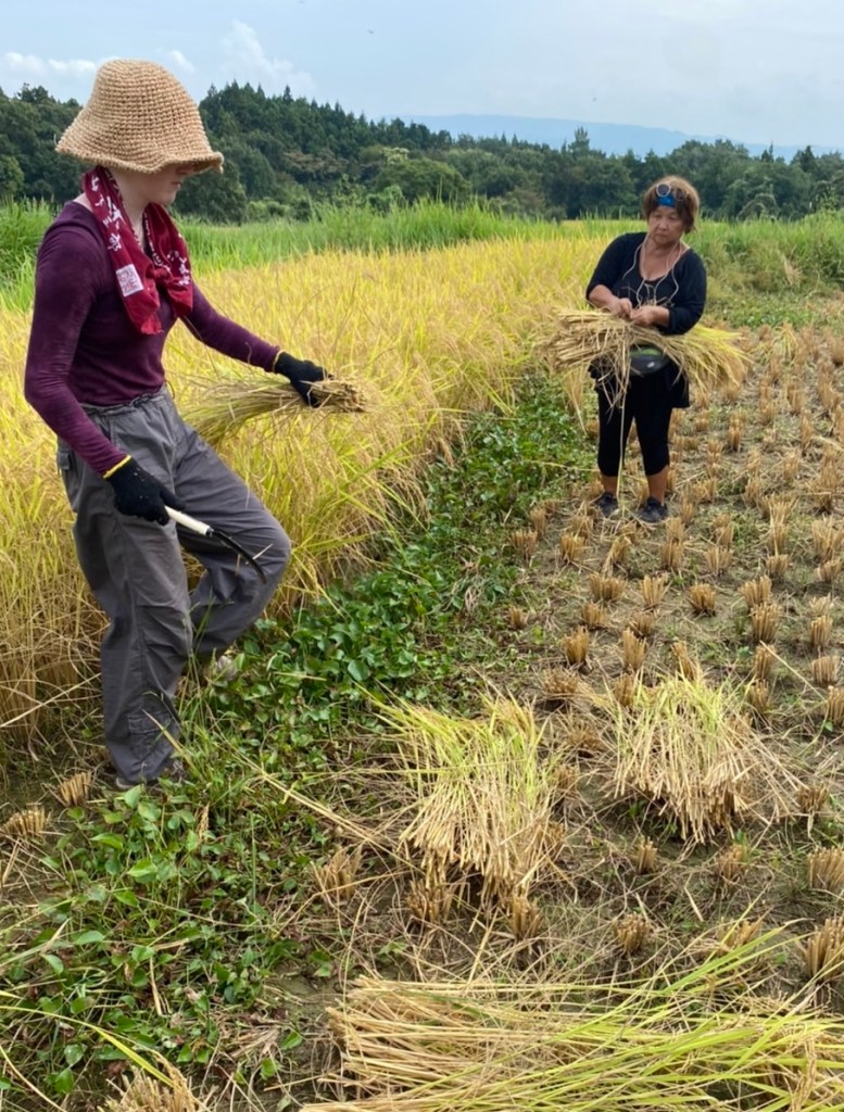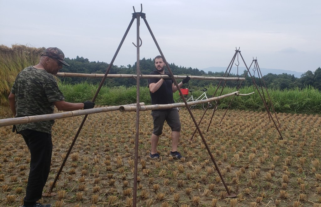 We went to assist a natural farmer. It was hard work. The farmer is a man in about his 40s who left Europe, acting and pursued the Buddhist monkhood. He trained to be a monk and actually became one, but left when he discovered hypocrisy. Monks originally believed in refraining from things of the world, but then it became more a commercial and profitable “business”. He said that when you study to become a monk you cannot drink and do other worldy things, but when you become a monk you can. They spend alot of money on the finest robes, etc. and he could not condone that hypocrisy. He left and now does organic farming. He seems very happy with his choice as he loves working outdoors and with his hands. When rice is not being grown, he works on building additions and improvements to his home. He did use a machine to cut and bundle the rice, Thank goodness! Then we picked up the stacks and put them on racks to dry. Tedious work and hard in the hot sun. He does this mostly by himself, with temporary help from his mother and father who are visiting from Germany.