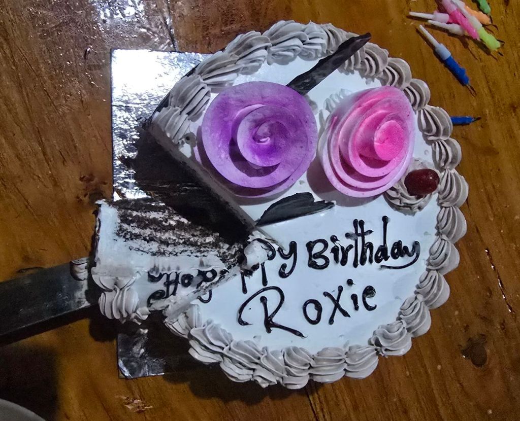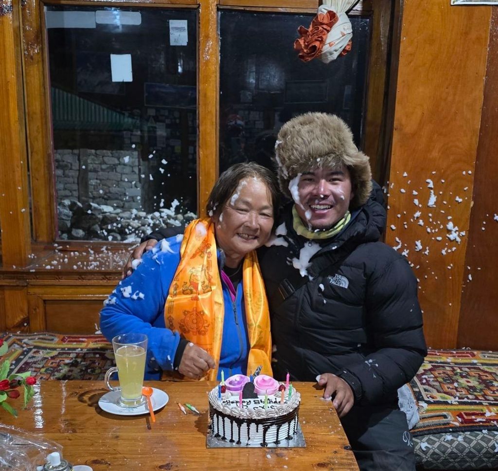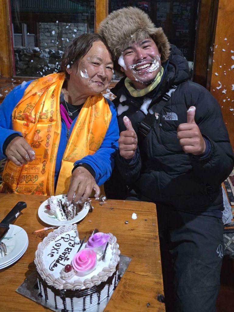 I was dreading the return and toyed with the idea of just taking a helicopter out, but Jhit and Krishna wouldn’t be with me. So I will walk… with them. Jhit said it would be easier to go down, so I trust his judgment. On the downhill trek, on the 25th, Jhit and Krishna surprised me with a birthday cake and more! We celebrated my big 7-0 in a guest house with the staff, chocolate cake, candles, cream, and plenty of smiles and laughter.