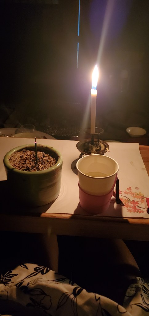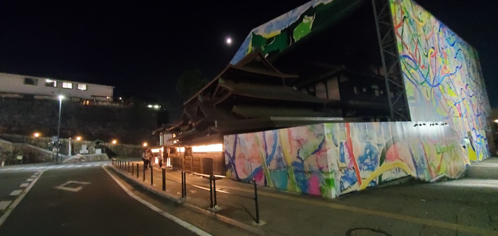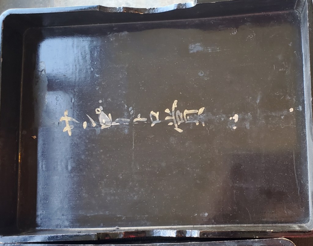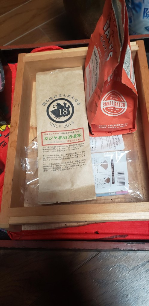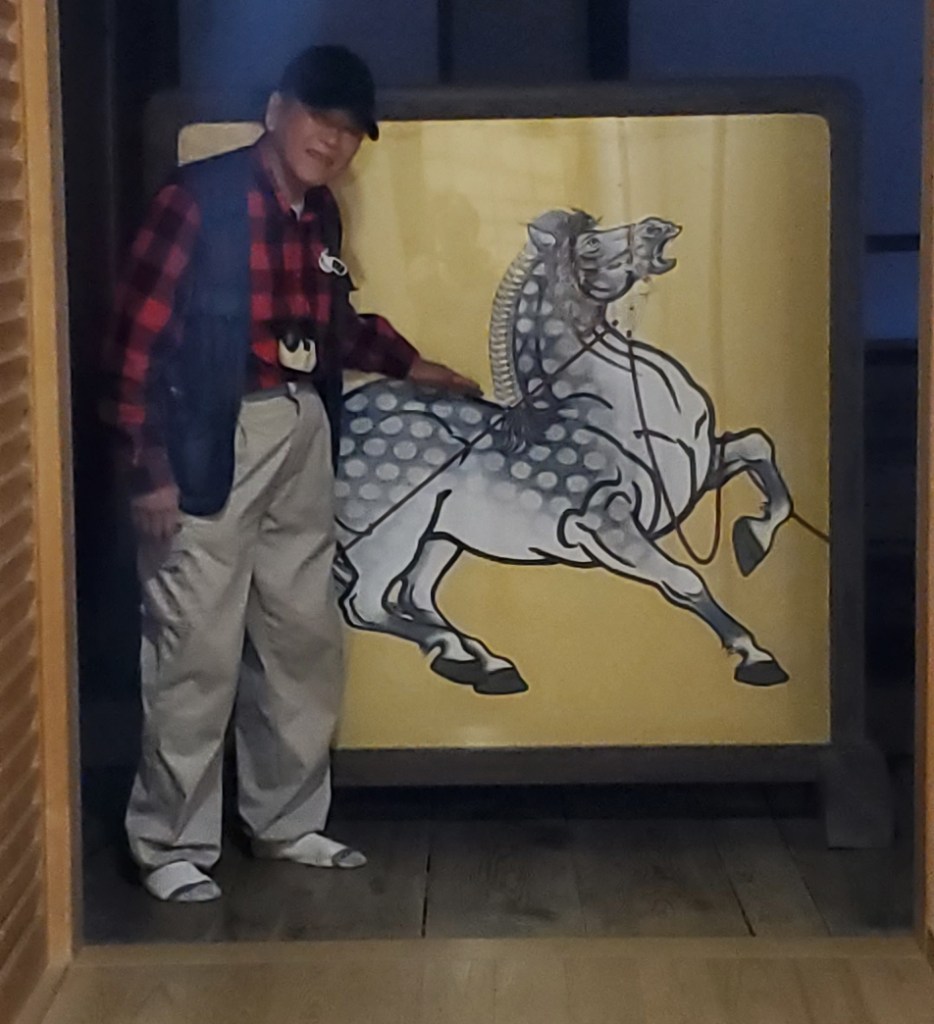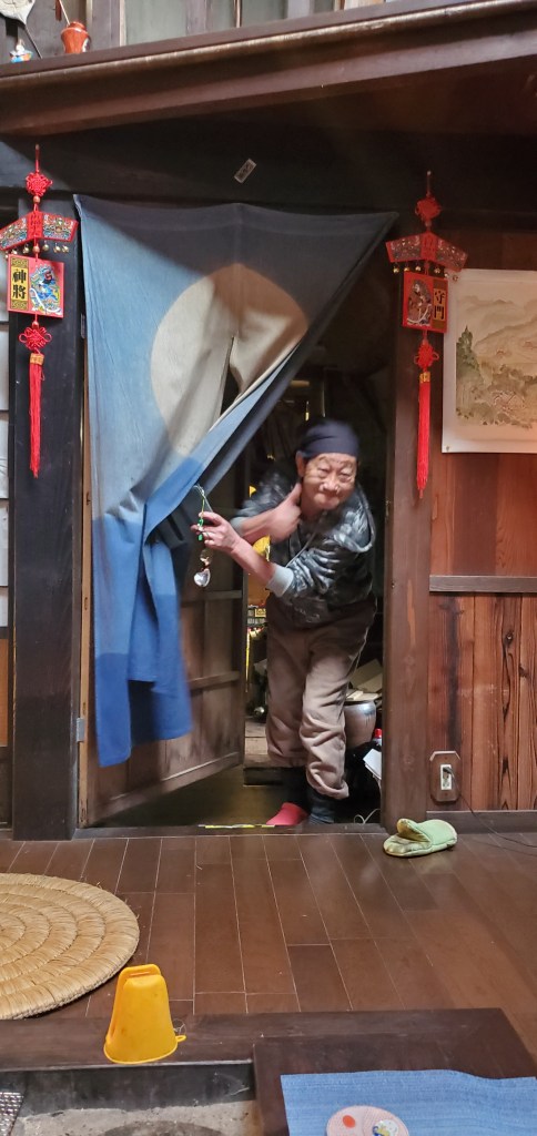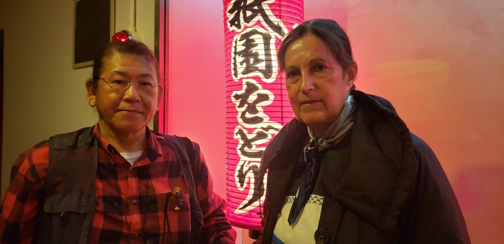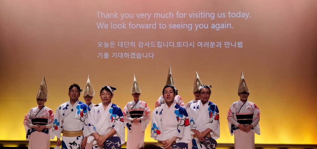 The one geisha in the middle was older I could tell and her movements were perfect. The musicians, Akio told me, were probable retired geisha. The musicians also performed in controlled synchronized movements, even to the point of turning the pages. At the end, during their bows, the geisha tossed tied sashes to the audience. Akio caught one. Now I have an awesome souvenir. We looked at it later and one of the geisha wrote a thank you and signed her name…