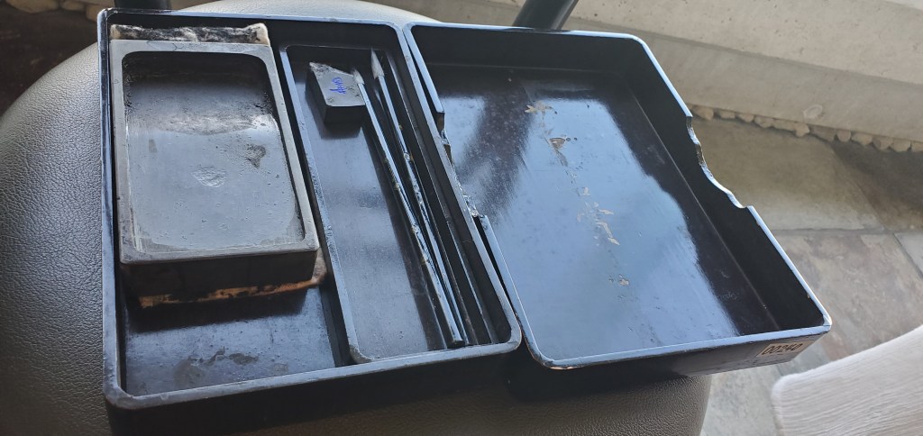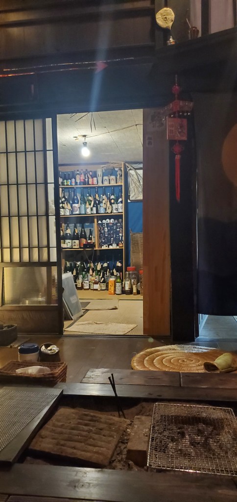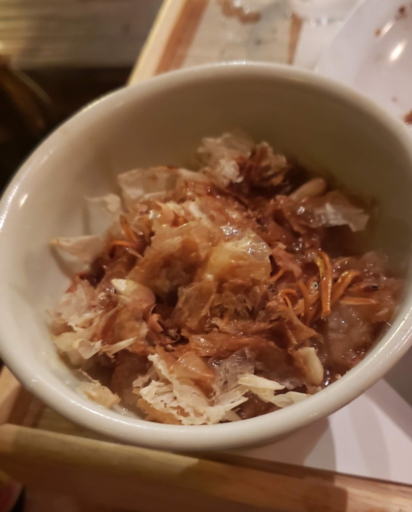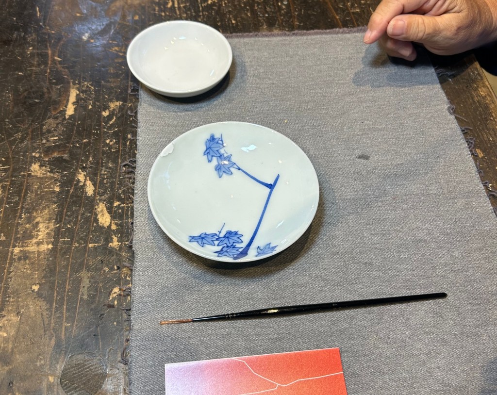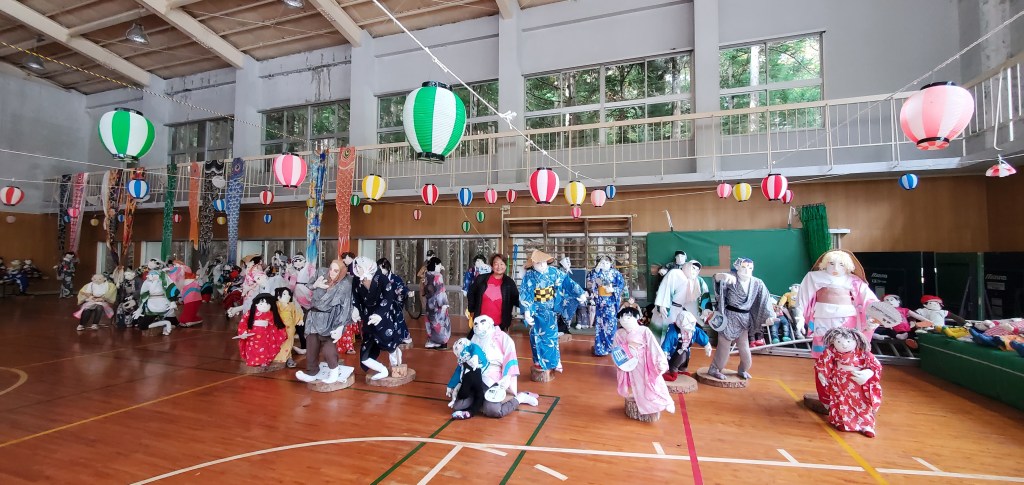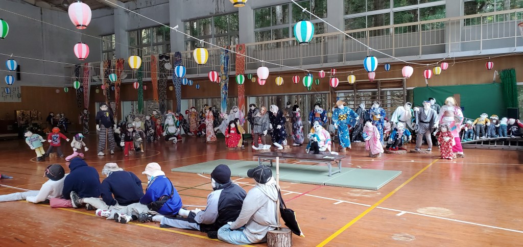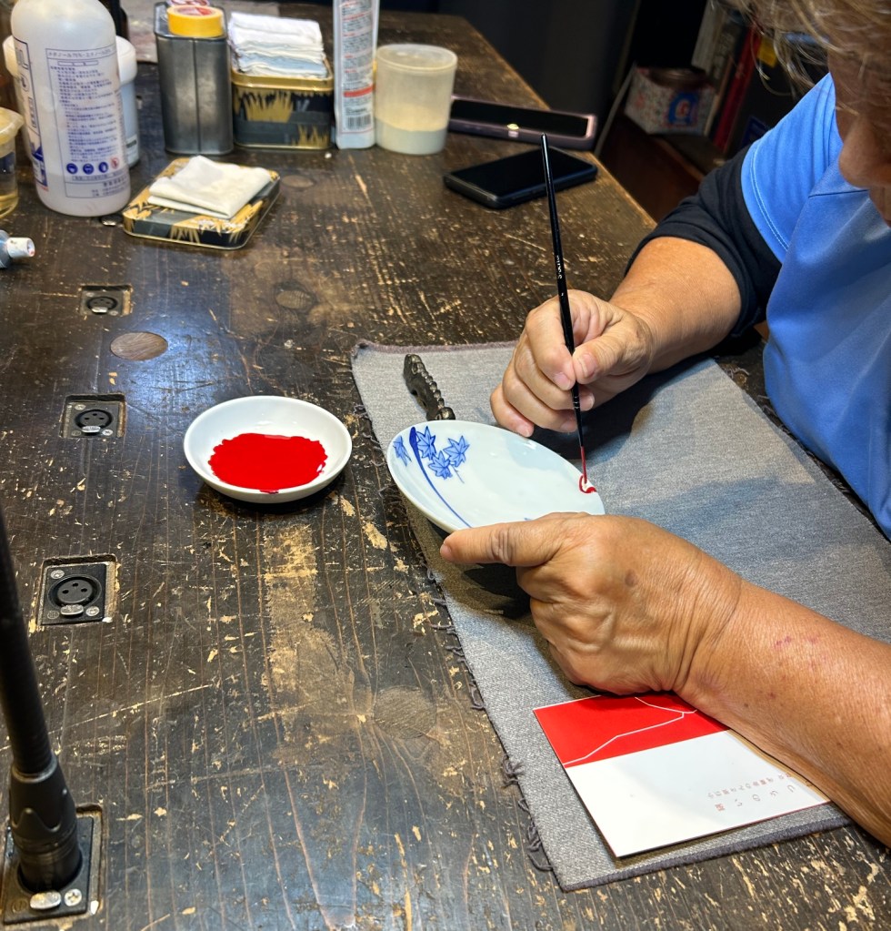 The one geisha in the middle was older I could tell and her movements were perfect. The musicians, Akio told me, were probable retired geisha. The musicians also performed in controlled synchronized movements, even to the point of turning the pages. At the end, during their bows, the geisha tossed tied sashes to the audience. Akio caught one. Now I have an awesome souvenir. We looked at it later and one of the geisha wrote a thank you and signed her name…