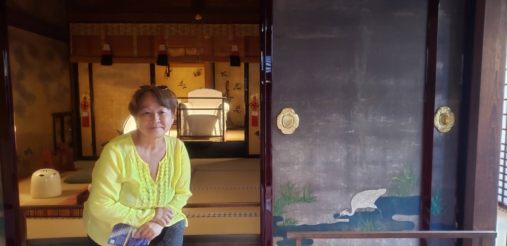 The performance was a real art. The stylized movements were slow and very controlled. The necks of the geisha seemed to be important and they all had long elegant necks. I could tell the Maiko from the Geisha as the Geisha were dressed in more subdued colors. The Maiko have more pronounced red makeup around the eyes and Maiko have lipstick on lower lip only. I really never knew the difference. Maiko are girls learning to be geisha. It takes years of training. The young girls enter after Jr high and live at the houses and learn skills from geisha. I wondered if there were still girls who wanted to join. Catherine said yes there are, not alot, but there still are some. It surprises me, because it seems like such a servitude way of life, but Catherine says it is still a respected field and they are taken care of.